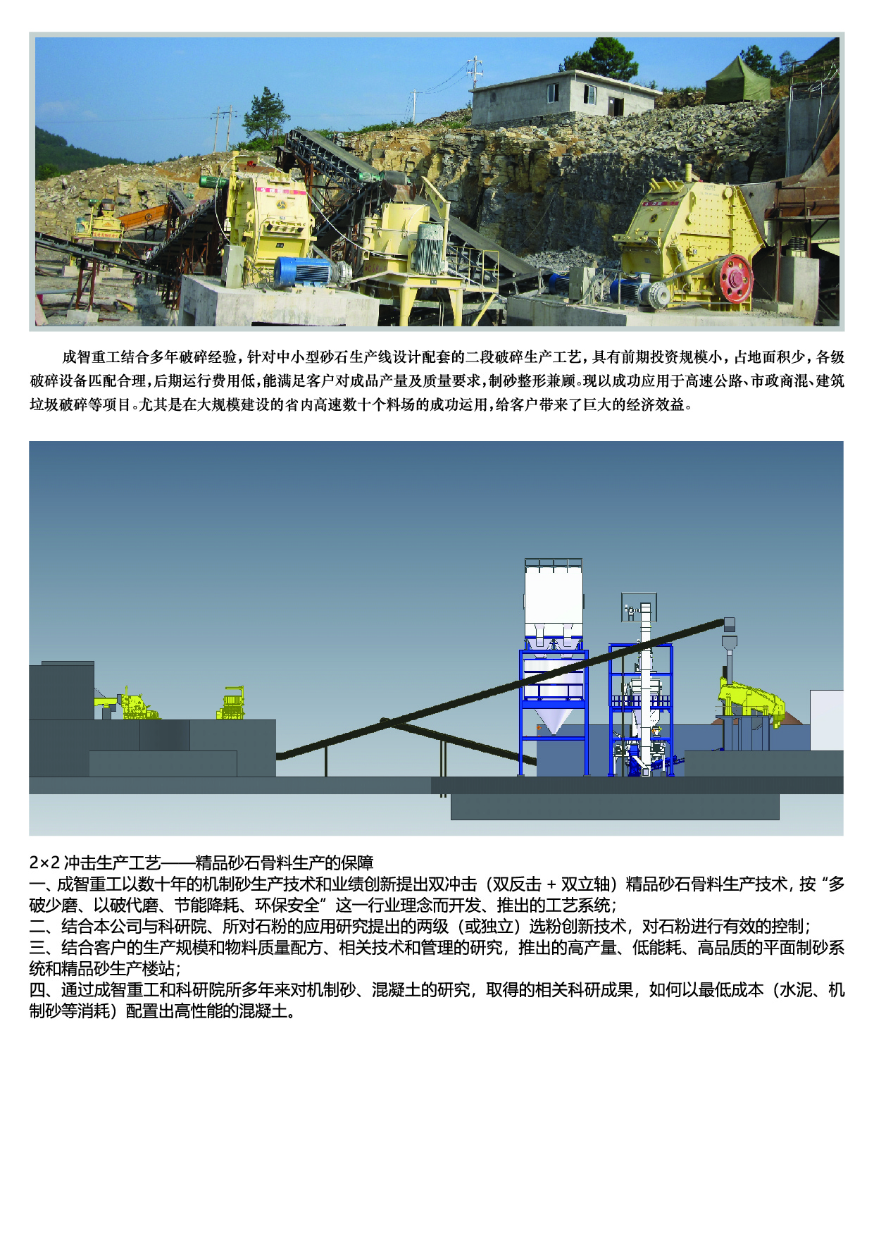 2×2沖擊生產工藝——精品砂石骨料生產的保障 一、成智重工以數十年的機制砂生產技術和業績創新提出雙沖擊(雙反擊+雙立軸)精品砂石骨料生產技術,按 “多破少磨、以破代磨、節能降耗、環保安全”這一行業理念而開發、推出的工藝系統; 二、結合本公司與科研院、所對石粉的應用研究提出的兩級(或獨立)選粉創新技術,對石粉進行有效的控制; 三、結合客戶的生產規模和物料質量配方、相關技術和管理的研究,推出的高產量、低能耗、高品質的平面制砂系統和精品砂生產樓站; 四、通過成智重工和科研院所多年來對機制砂、混凝土的研究,取得的相關科研成果,如何以最低成本(水泥、機制砂等消耗)配置出高性能的混凝土。
