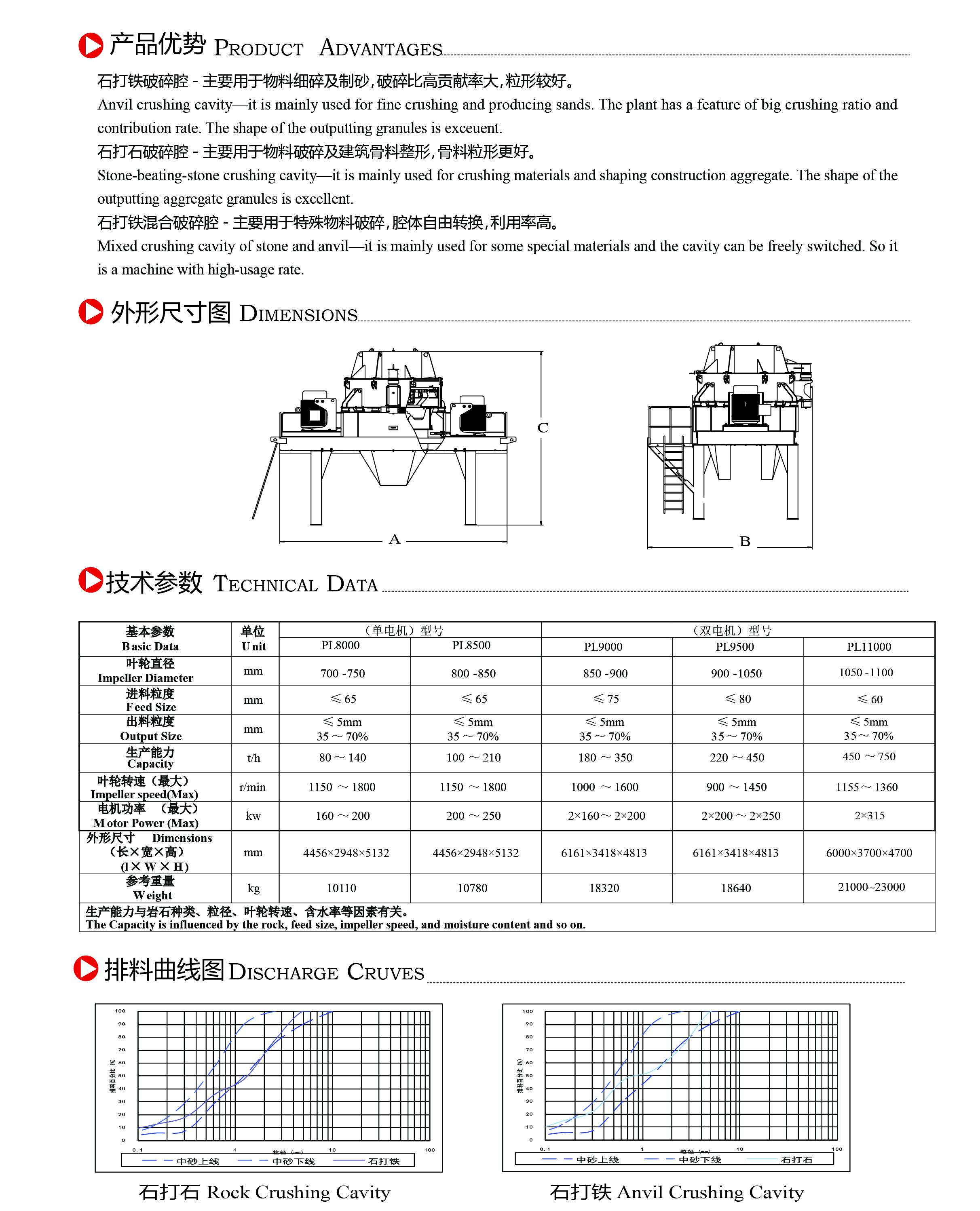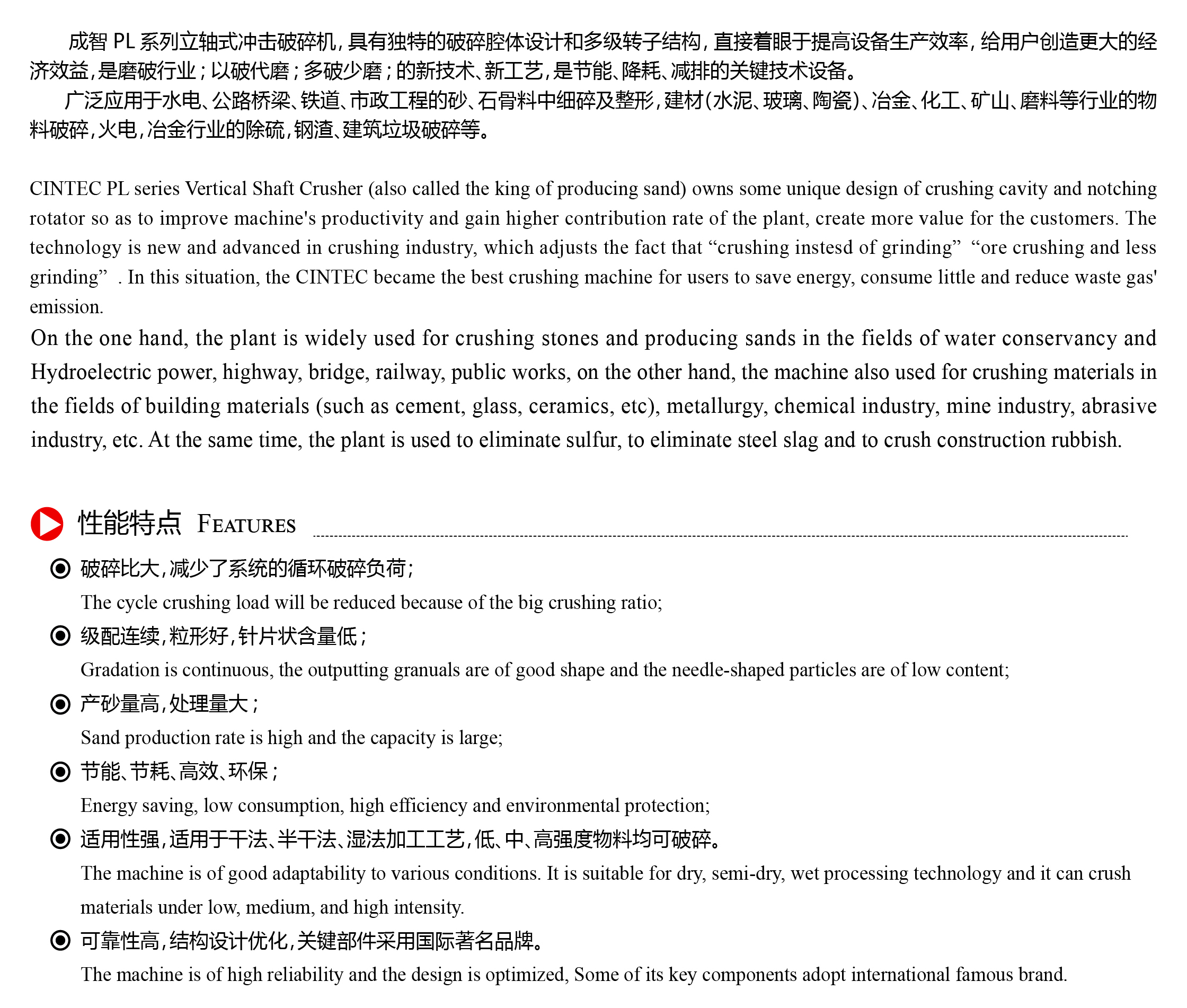 成智PL系列立軸式?jīng)_擊破碎機(jī),具有獨(dú)特的破碎腔體設(shè)計(jì)和多級(jí)轉(zhuǎn)子結(jié)構(gòu),直接著眼于提高設(shè)備生產(chǎn)效率,給用戶創(chuàng)造更大的經(jīng)濟(jì)效益,是磨破行業(yè);以破代磨;多破少磨;的新技術(shù)、新工藝,是節(jié)能、降耗、減排的關(guān)鍵技術(shù)設(shè)備。 廣泛應(yīng)用于水電、公路橋梁、鐵道、市政工程的砂、石骨料中細(xì)碎及整形,建材(水泥、玻璃、陶瓷)、冶金、化工、礦山、磨料等行業(yè)的物料破碎,火電,冶金行業(yè)的除硫,鋼渣、建筑垃圾破碎等。